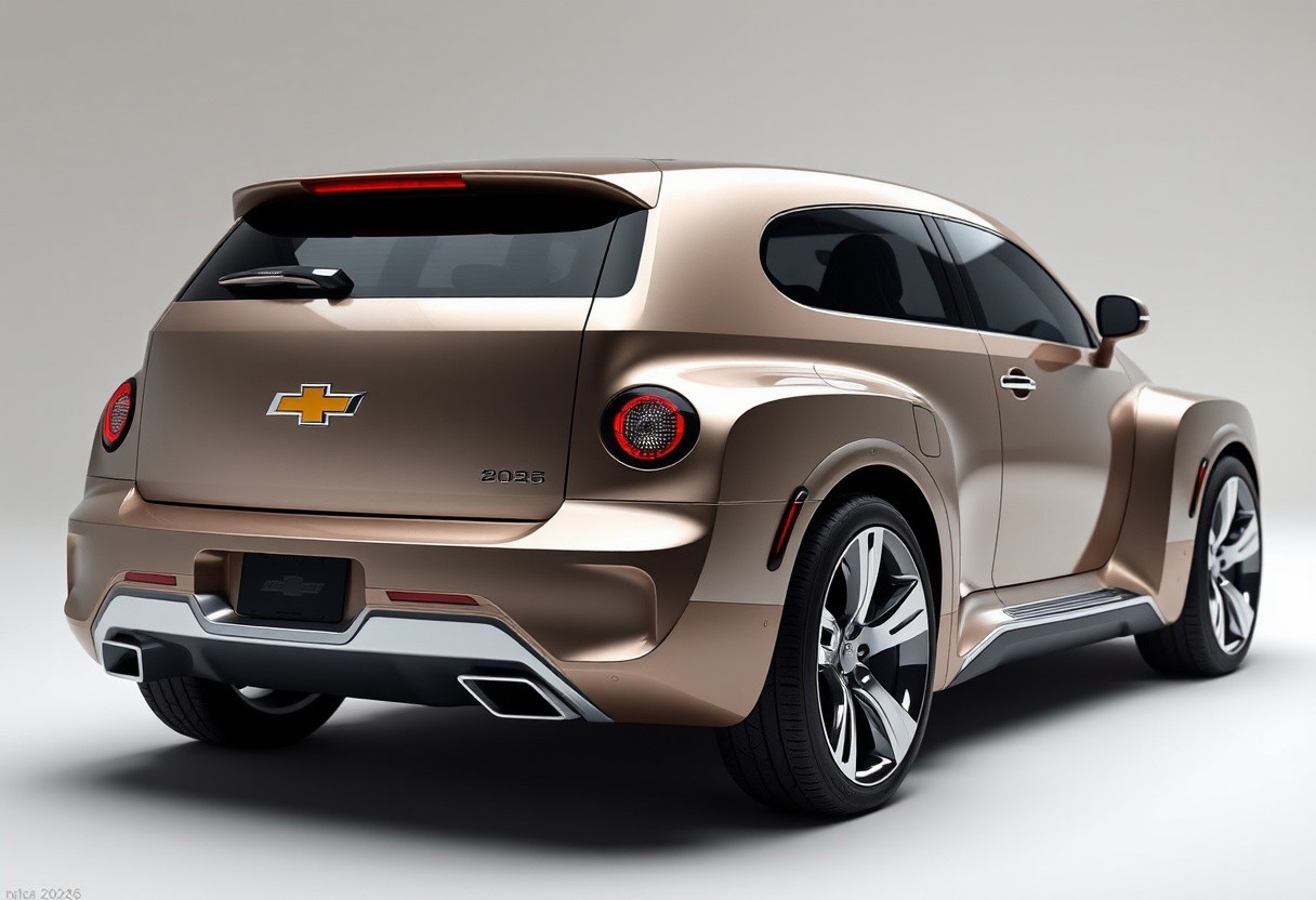 hyperrealistic, hypermaximalist, absurdres, detailfetishist, Chevy 2026 concept car, based on the Chevy HHR, retro curves from 1940s Chevy, smooth flowing lines, rounded fenders, chrome accents, sleek modern details, sharp angular elements, thin LED headlights, geometric design, futuristic rear design, aggressive yet elegant, bold wheel arches, vintage aesthetic fused with futuristic touches, concept car style, high resolution, sharp details, dynamic composition, metallic paint finish, [blurry:-1.6], [overexposed:-1.5], [clunky design:-1.5], [dull colors:-1.4], [low resolution:-1.7], [boring shapes:-1.5], [flat lighting:-1.4]