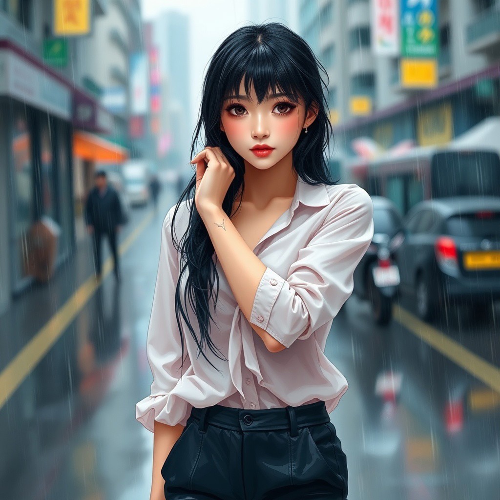 score_9, score_8_up, (high quality), highly detaily , Expressiveh, solo, beautiful, 1 girl, Asian, wet, a girl on the (street) on a rainy day, loose hair, black hair, bright dark eyes, glossy lips, wet clothes, (big breasts), perfect body, wearing a blouse and pants