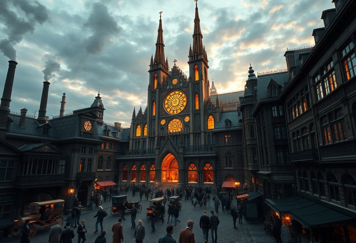 A bustling European city inspired by Victorian-era industrial architecture. Intricate ironwork, soot-covered stone facades, and towering chimneys spew smoke over the busy cobblestone streets filled with mechanized carriages and bustling crowds. At the city's heart stands a grand fantasy cathedral dedicated to the God of the Eternal Blazing Sun. Its radiant golden spires rise toward the sky, while stained glass windows depict celestial scenes, casting divine light across the square. The cathedral’s gothic arches and sun symbols glow with an ethereal energy. The central sun disk hovers, radiating warm light, a stark contrast to the surrounding dark, soot-covered buildings. The city’s gas lamps flicker against the rough stone, while the cathedral glows with divine radiance. The mix of industrial grit and divine beauty creates a striking atmosphere as the city comes alive beneath the dramatic evening sky. As dusk falls, the celestial aura intensifies, casting long shadows, while distant bells chime, summoning worshippers toward the golden-lit pathways of the cathedral. Ultra-realistic, 32k, Masterpiece, High Quality, with High Detailed Skin and Realistic Lighting, capturing the beautiful, intricate background in stunning detail. Official art, emphasizing epic, detailed realism. (Ultra Realistic:1.0), 32k, (Masterpiece:1.0), (High Detailed Skin:1.0), (High Quality:1.0), (Detailed Realistic Background:1.3), (Official Art, Beautiful:1.2), (Realistic Lighting:1.0).