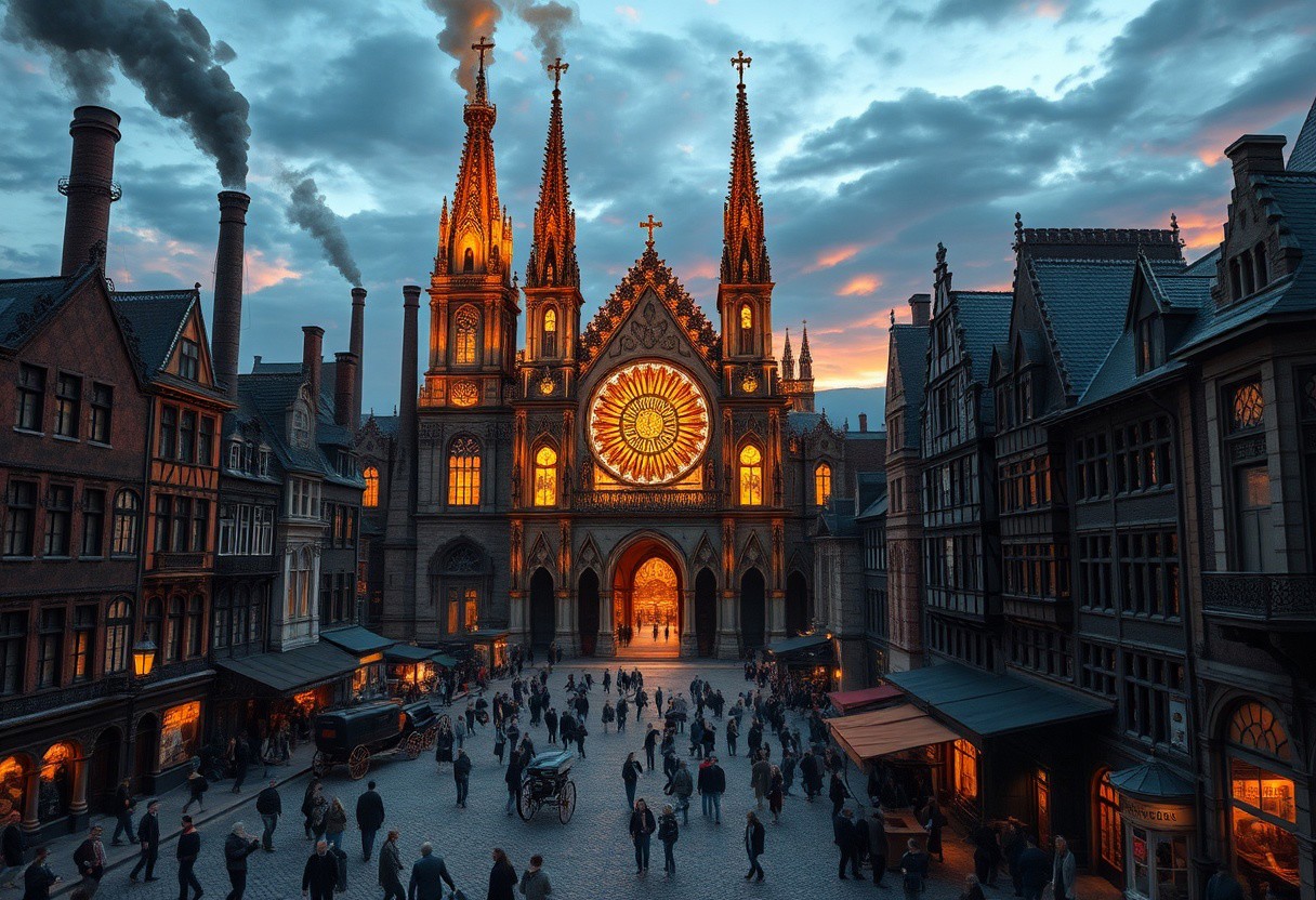 A bustling European city inspired by Victorian-era industrial architecture. Intricate ironwork, soot-covered stone facades, and towering chimneys spew smoke over the busy cobblestone streets filled with mechanized carriages and bustling crowds. At the city's heart stands a grand fantasy cathedral dedicated to the God of the Eternal Blazing Sun. Its radiant golden spires rise toward the sky, while stained glass windows depict celestial scenes, casting divine light across the square. The cathedral’s gothic arches and sun symbols glow with an ethereal energy. The central sun disk hovers, radiating warm light, a stark contrast to the surrounding dark, soot-covered buildings. The city’s gas lamps flicker against the rough stone, while the cathedral glows with divine radiance. The mix of industrial grit and divine beauty creates a striking atmosphere as the city comes alive beneath the dramatic evening sky. As dusk falls, the celestial aura intensifies, casting long shadows, while distant bells chime, summoning worshippers toward the golden-lit pathways of the cathedral. Ultra-realistic, 32k, Masterpiece, High Quality, with High Detailed Skin and Realistic Lighting, capturing the beautiful, intricate background in stunning detail. Official art, emphasizing epic, detailed realism. (Ultra Realistic:1.0), 32k, (Masterpiece:1.0), (High Detailed Skin:1.0), (High Quality:1.0), (Detailed Realistic Background:1.3), (Official Art, Beautiful:1.2), (Realistic Lighting:1.0).