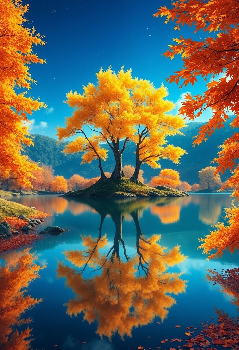 Stunning detail reflection of golden and orange katsura trees around a natural round lake, autumn, realistic, wide shot, art style of Studio Ghibli, magical, whimsical atmosphere, vibrant colors, beautifully lit, serene landscape