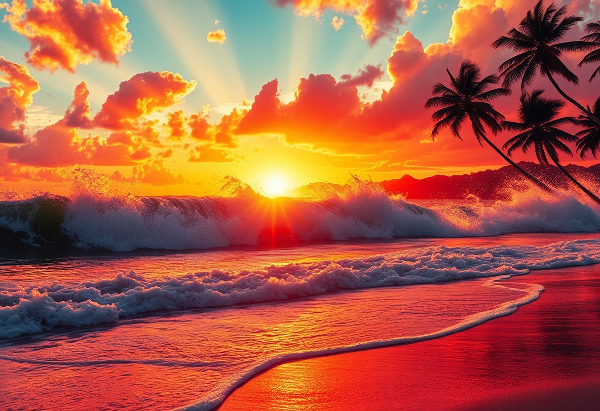 dynamic sunset over the water, vibrant orange and pink hues reflecting off large crashing waves, powerful and dramatic ocean waves rolling towards the shore, distant mountains on the horizon, warm golden glow illuminating the scene, dramatic clouds with sunbeams breaking through, tropical setting with palm trees swaying in the wind, rich colors, high-resolution, ultra-realistic textures, dynamic motion in the water, subtle reflections on the wet sand, romantic yet intense atmosphere, picturesque landscape, tropical paradise, (overexposed lighting:-1.5), (blurry details:-1.6), (dull colors:-1.5), (flat composition:-1.4), (calm waters:-1.6)