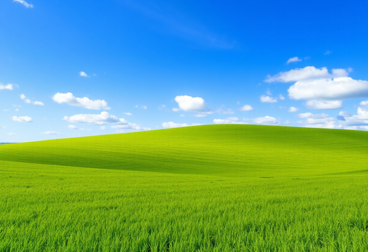 lush green field, iconic rolling hills, bright and vibrant green grass stretching far into the horizon, blue sky with scattered fluffy clouds, clear and sunny day, high-resolution, ultra-realistic textures, serene and peaceful atmosphere, vast open landscape, inspired by the classic Windows wallpaper, soft gentle slopes, minimalistic yet beautiful, perfect symmetry in nature, tranquil and calming mood, (blurry details:-1.6), (overexposed lighting:-1.5), (dull colors:-1.5), (flat composition:-1.4), (urban elements:-1.6)