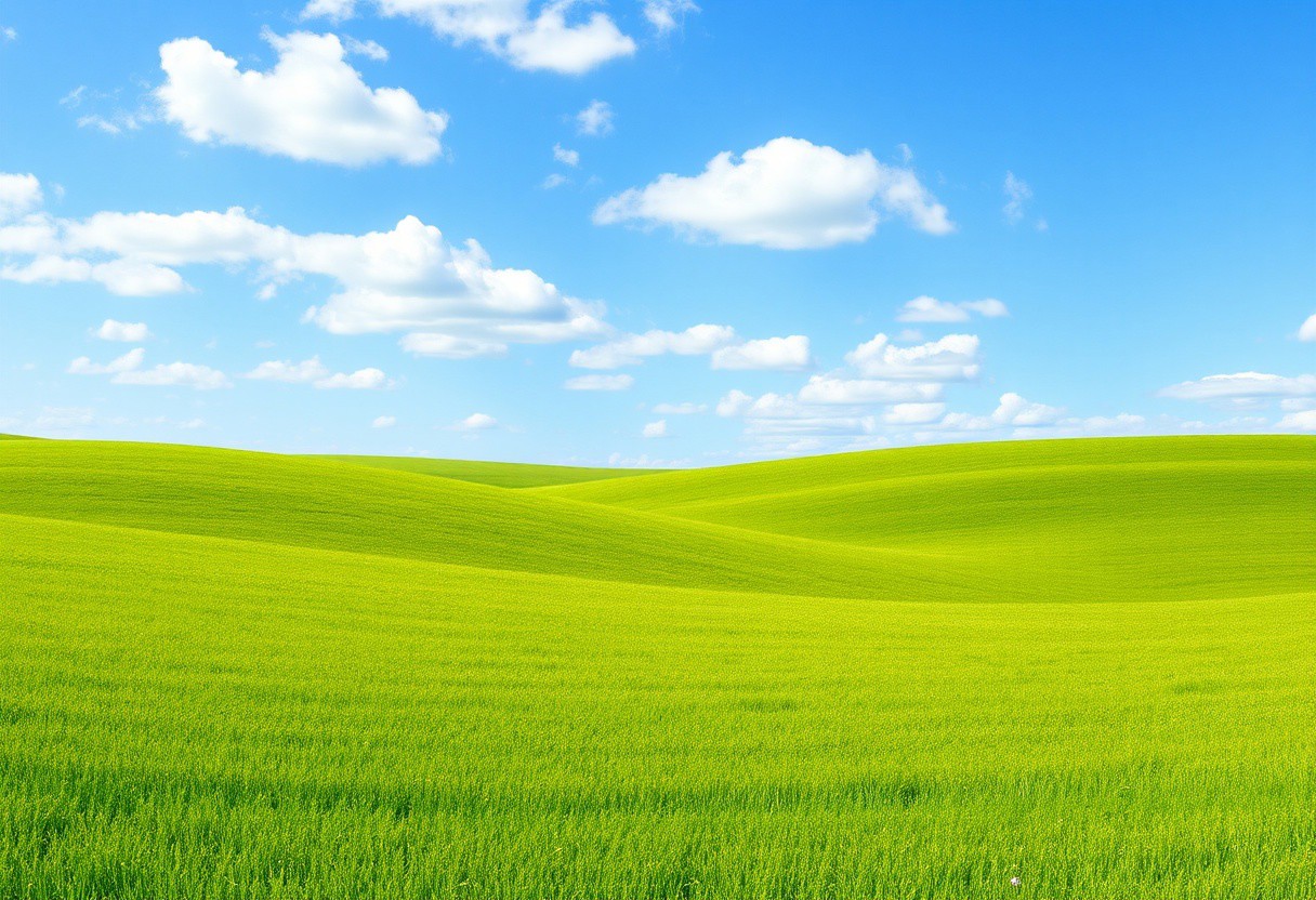 lush green field, iconic rolling hills, bright and vibrant green grass stretching far into the horizon, blue sky with scattered fluffy clouds, clear and sunny day, high-resolution, ultra-realistic textures, serene and peaceful atmosphere, vast open landscape, soft gentle slopes, minimalistic yet beautiful, perfect symmetry in nature, tranquil and calming mood, (blurry details:-1.6), (overexposed lighting:-1.5), (dull colors:-1.5), (flat composition:-1.4), (urban elements:-1.6)