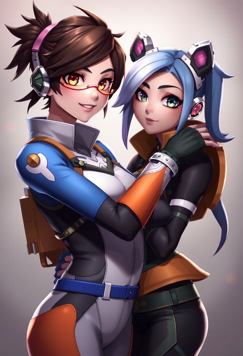 Tracer from Overwatch and Jinx from League of Legends holding each other whilst staring at the viewer