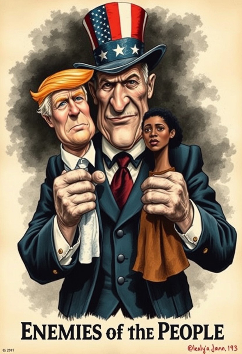 world war I military propaganda poster showing the "enemies of the people", the caricature drawing in the style of a gravure depicts an evil greedy capitalist with 3 piece suit and a American flag top hat who is holding two sock puppets, puppets in which he has his hands, one puppet is of an old white man with orange hair resembling Trump, the other puppet is that of a tanned short haired mixed india african woman resembling kamala harris, the a title at the bottom that reads "Enemies of the People"