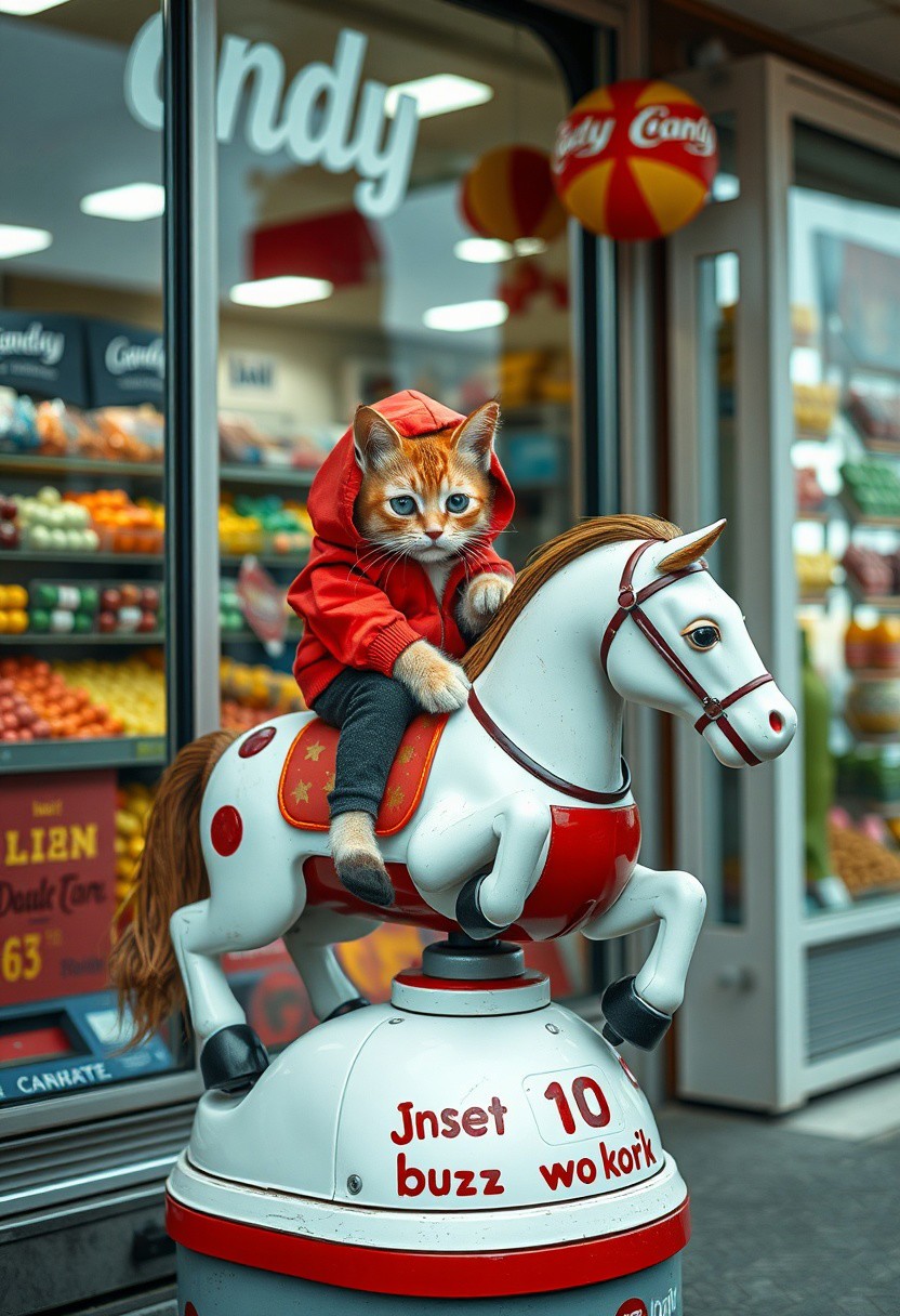 outside a candy store, little sad cat with red hoodie is sitting atop and riding a coin-operated robotic pony the pony is white with brown the label on the base of the machine reads "Insert 10 buzz to work ", photo-realistic