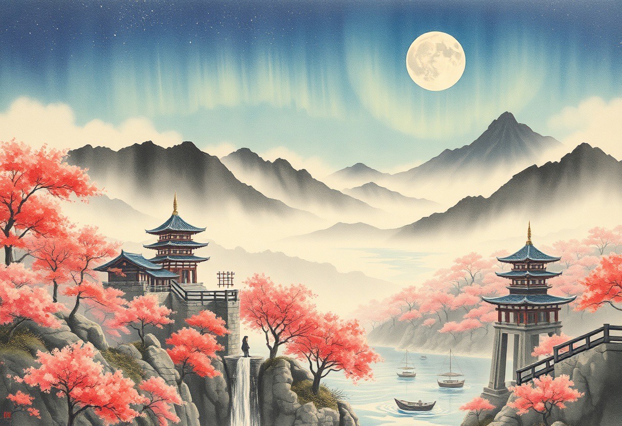 (Ink illustration on parchment, watercolor, ink splashes, Ukiyo-E). ((watercolor)), ((Chinese landscape)), Pagodas, Red-Trees, landscape focus, small figure off-side, Japanese landscape, Rivers, Lake, Clouds, with watercolor washes, (((sakura forest landscape))), (((mist, waterfalls))), ((pink trees, sakura trees, vivid pink treetops)), (((full moon, moonbeams))), endless sakura forests that stretch outward to the horizon, dotted with the ruins of an ancient destroyed civilization, crumbling stone, degraded buildings and temple, a long magical aurora borealis stretching across the sky, a broken moon high in the sky partially turned into an asteroid belt, a Saturn-like ringed-planet world, flickers of magical energy illuminating the land, in the far distance a giant wall of smoke is rising from the shattered earth in which a multitude of faces are forming and screaming, Ink splashes, rough ink sketch, Ghibli style, high contrast, stylized, dark skin, close up on face, head and shoulder, leather medieval top with lowered hood, Art Nouveau Style, detailxl, BadDream, dioramas,