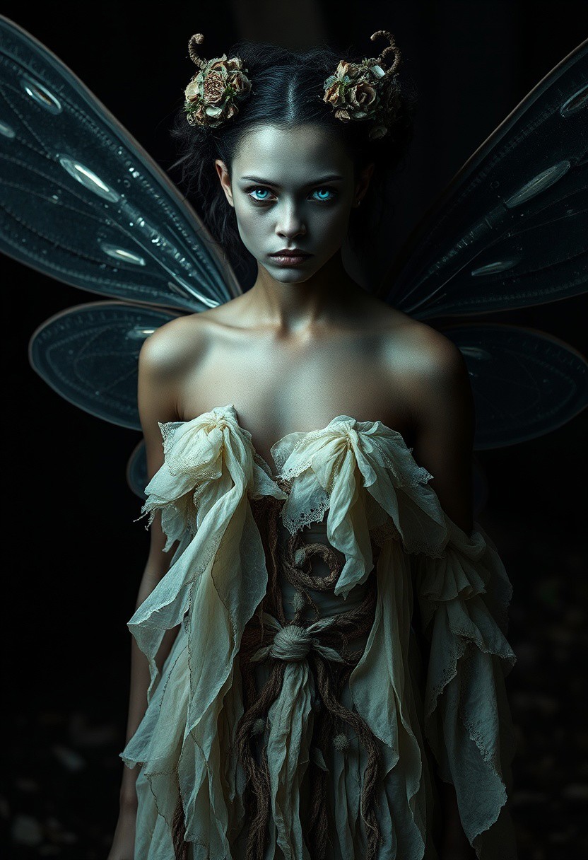 An evocative dark fantasy photography. The central figure is a once-elegant forest african fairy, now corrupted by sinister forces. She has buterfly wings like attributes, a pale complexion, glowing blue eyes. Her once-lush attire is now tattered and overgrown with the transparency that she once represented. The background is dark and foreboding, reflecting the fairy's lost beauty and anger. The overall atmosphere is cinematic and conceptual, immersing the viewer in a world of dark fantasy., cinematic, dark fantasy
