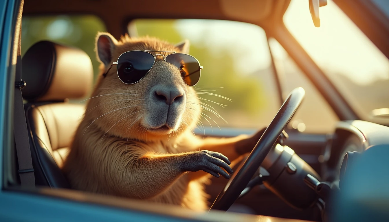 A photorealistic shot of a capybara in the driver’s seat, paws on the wheel, head out the window. The capybara wears sunglasses, and the bright sunlight gives a carefree vibe.