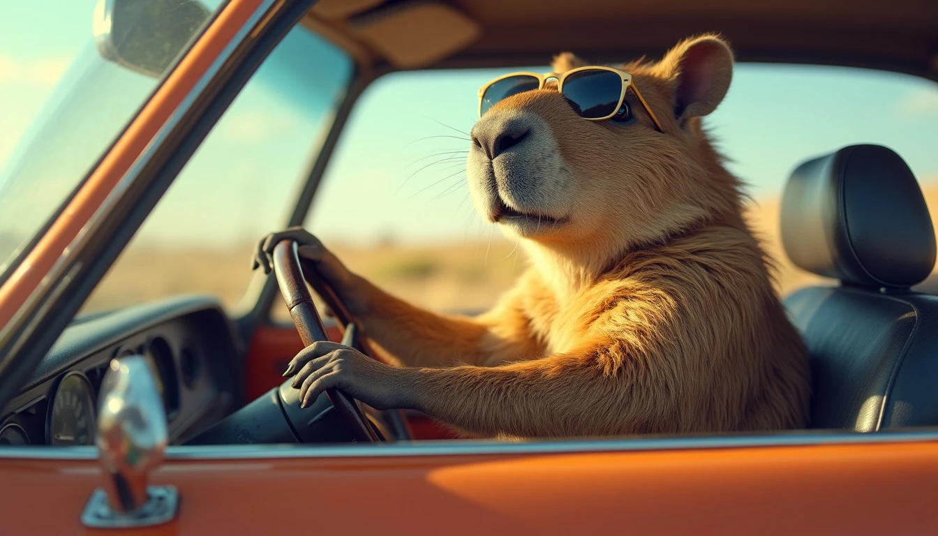 A photorealistic shot of a capybara in the driver’s seat, paws on the wheel, head out the window. The capybara wears sunglasses, and the bright sunlight gives a carefree vibe.
