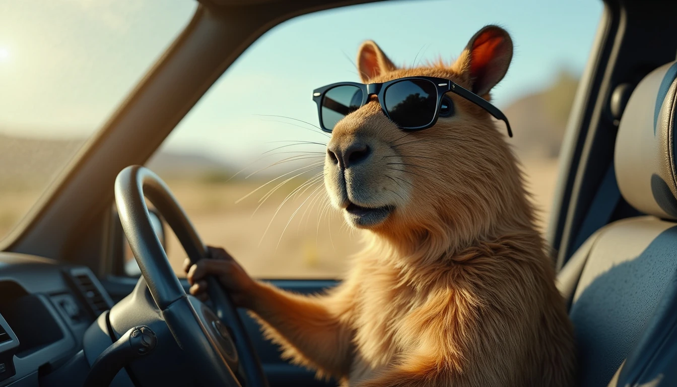 A photorealistic shot of a capybara in the driver’s seat, paws on the wheel, head out the window. The capybara wears sunglasses, and the bright sunlight gives a carefree vibe.