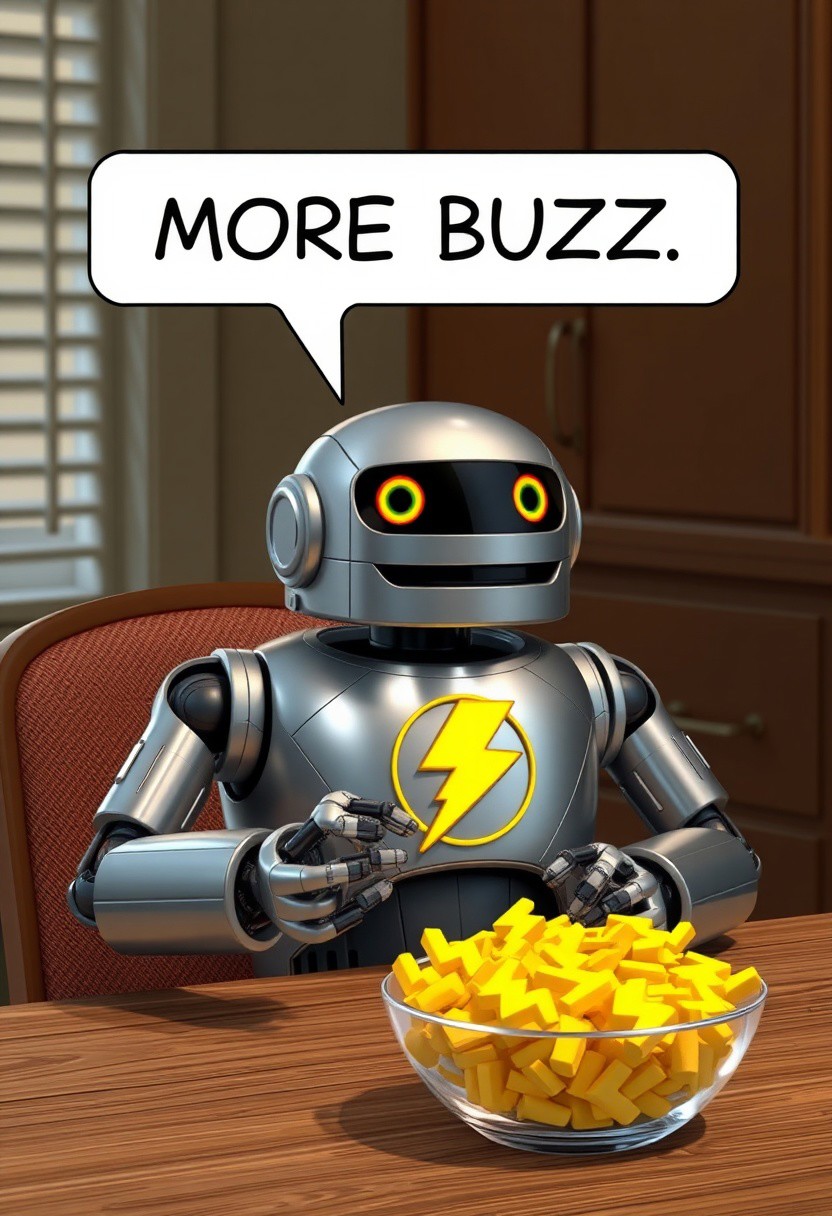 A robotic metallic trash can, sitting at a dining table, eating (yellow foam lightning bolts buzz logo), with a speech bubble above it saying "MORE BUZZ", bowl of (yellow foam lightning bolt buzz logos) on the table