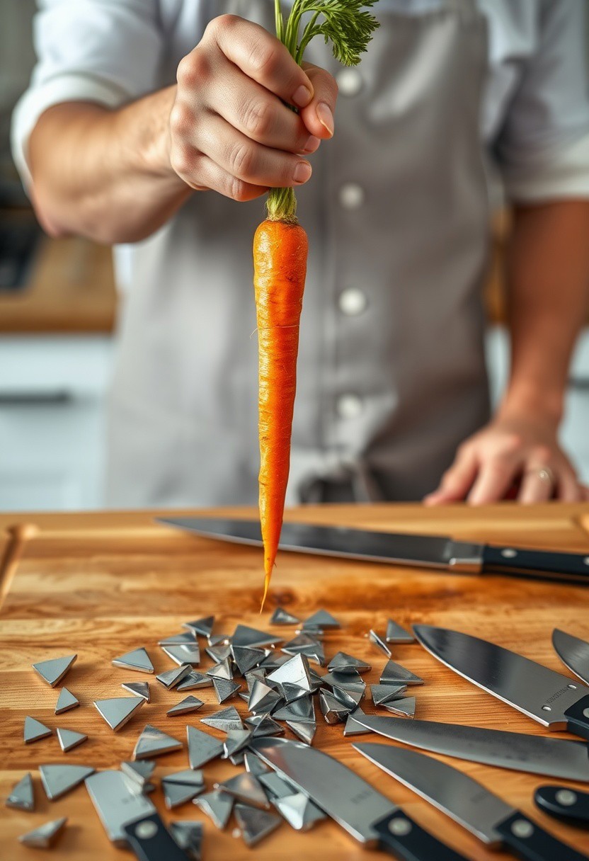 imagine a photo of a cook in a kitchen holding a single long carrot like a roman sword, his hand wrapped around the stem of the carrot and the long pink orange pointy root extending away. the bottom half of the image shows the counter top with a wooden cutting board. On the board we see many small broken pieces of shiny metal, the broken metal looks like broken knives, clean slices of metal, we can only see metal triangles made from small pieces of shiny metal and black kitchen knife handles. cooking show parody