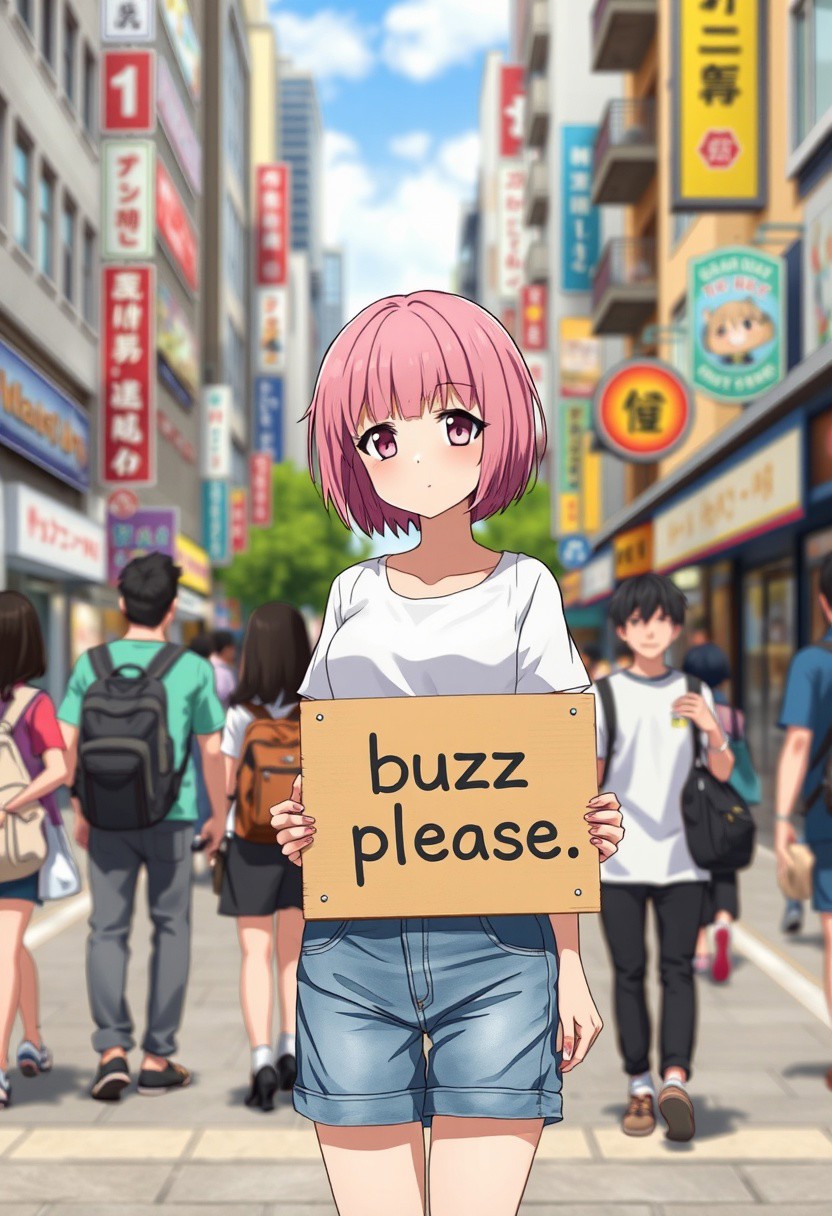 anime girl with short pink hair wearing a white t-shirt and denim shorts holding a cardboard sign that says 'buzz please', standing in a busy city street with bustling people around