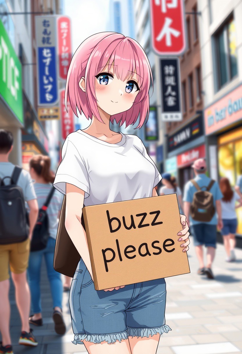 anime girl with short pink hair wearing a white t-shirt and denim shorts holding a cardboard sign that says 'buzz please', standing in a busy city street with bustling people around