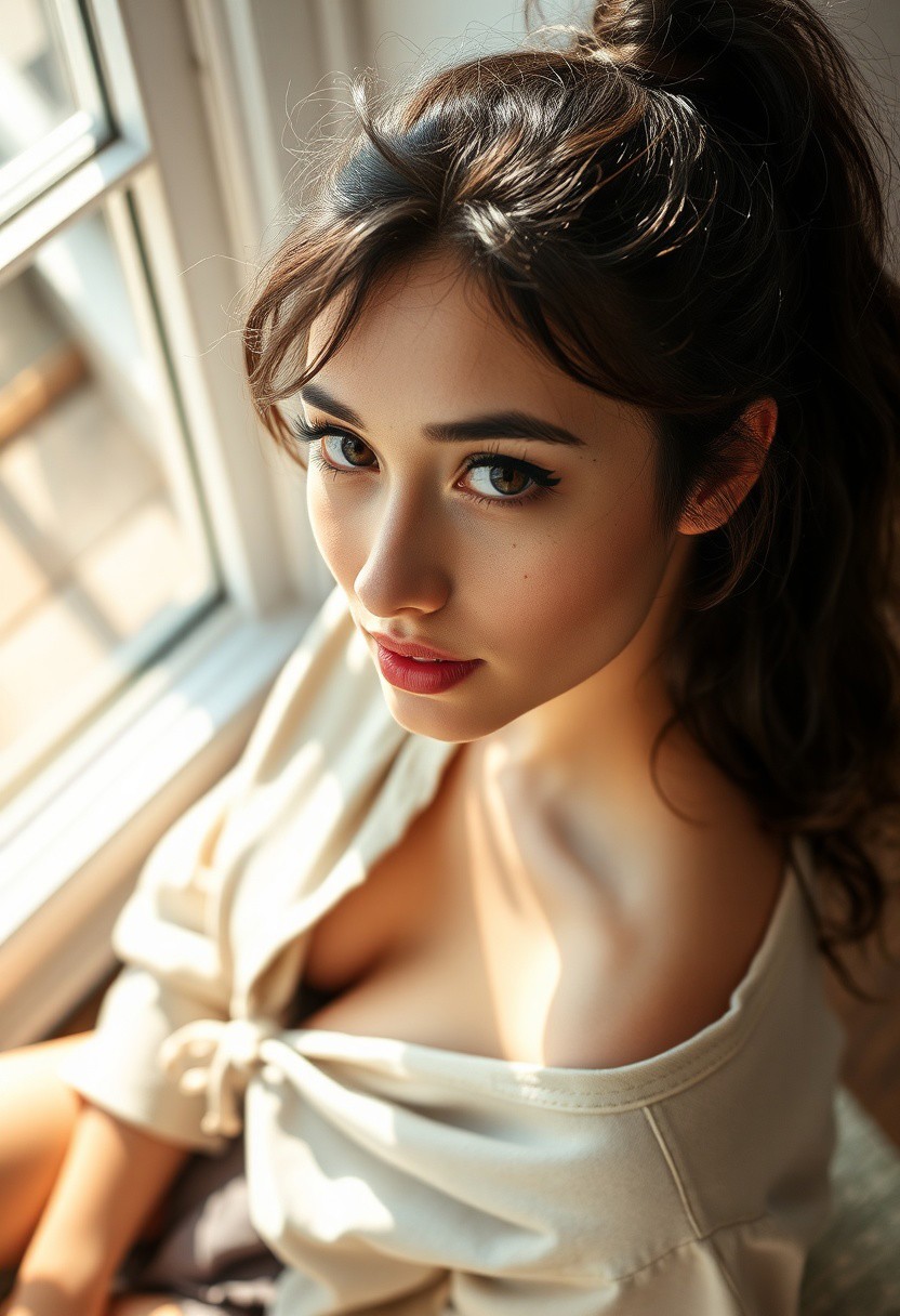 The image is a high-resolution photograph featuring a young woman sitting with her back against a bright window. rays of light enter through the window. the photo is taken from above,looking down at her. She is a woman with a light skin tone who is proud of her body. her shoulders are back and her chest pushed out. Button nose, full lips. Her long, slightly curly dark hair is styled into a messy ponytail on top of her head, with a few loose strands framing her face. She has striking hazel eyes with winged eyeliner, and has freckles over her nose. she is blushing, natural makeup look.oversized shirt, perky breasts