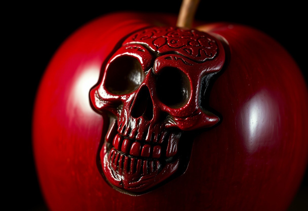A gorgeous, shiny red apple (Product RED) with a large, deeply carved, intricate skull design. The skull is prominent, with deep incisions that emphasize its dark, haunting details. The scene is lit with cinematic lighting using Panavision lenses, in a close-up shot. The high-resolution image showcases vivid, intense colors, highlighting the glossy apple surface against the deep, eerie contours of the skull