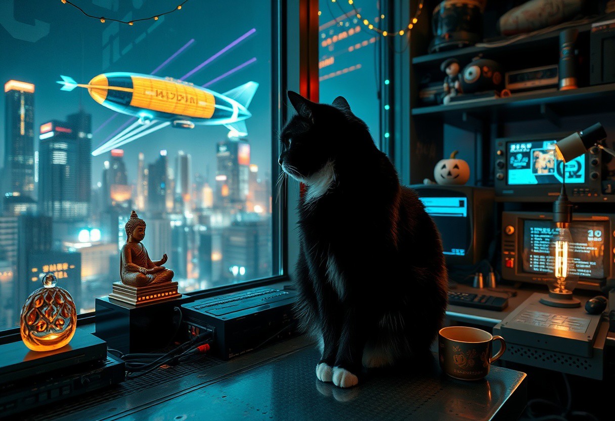 The focus is on a black cat with white feet and white neck is sitting on a metal desk among a clutter of electronics, the cat is staring out of a large window looking out at the futuristic night time cyberpunk city skyline with skyscrapers and a large futuristic dirigible adorned with lights and displaying advertisements in Japanese. A small buddha statue composed of crystal, gold, and glowing copper and jewels, sits on a high shelf, exquisite detail, halloween decorations, halloween string lights, Metal surfaces, halloween themed string lights hanging from the ceiling, small halloween figurines on the desk, electronics, wide angle view of room, cyberpunk style apartment with futuristic aesthetic with neon and led lighting, antique electronic devices, the room contains many electronics and futuristic displays displaying code and images of the robots schematics, a young slender Japanese woman, 24 years old, is standing next to the cat looking out the window, wearing an ornate Japanese Yukata Robe and drinking a cup of tea. The room is lit by blue, green and red neon lights of computers and electronics in the room as well as an antique filament lamp.