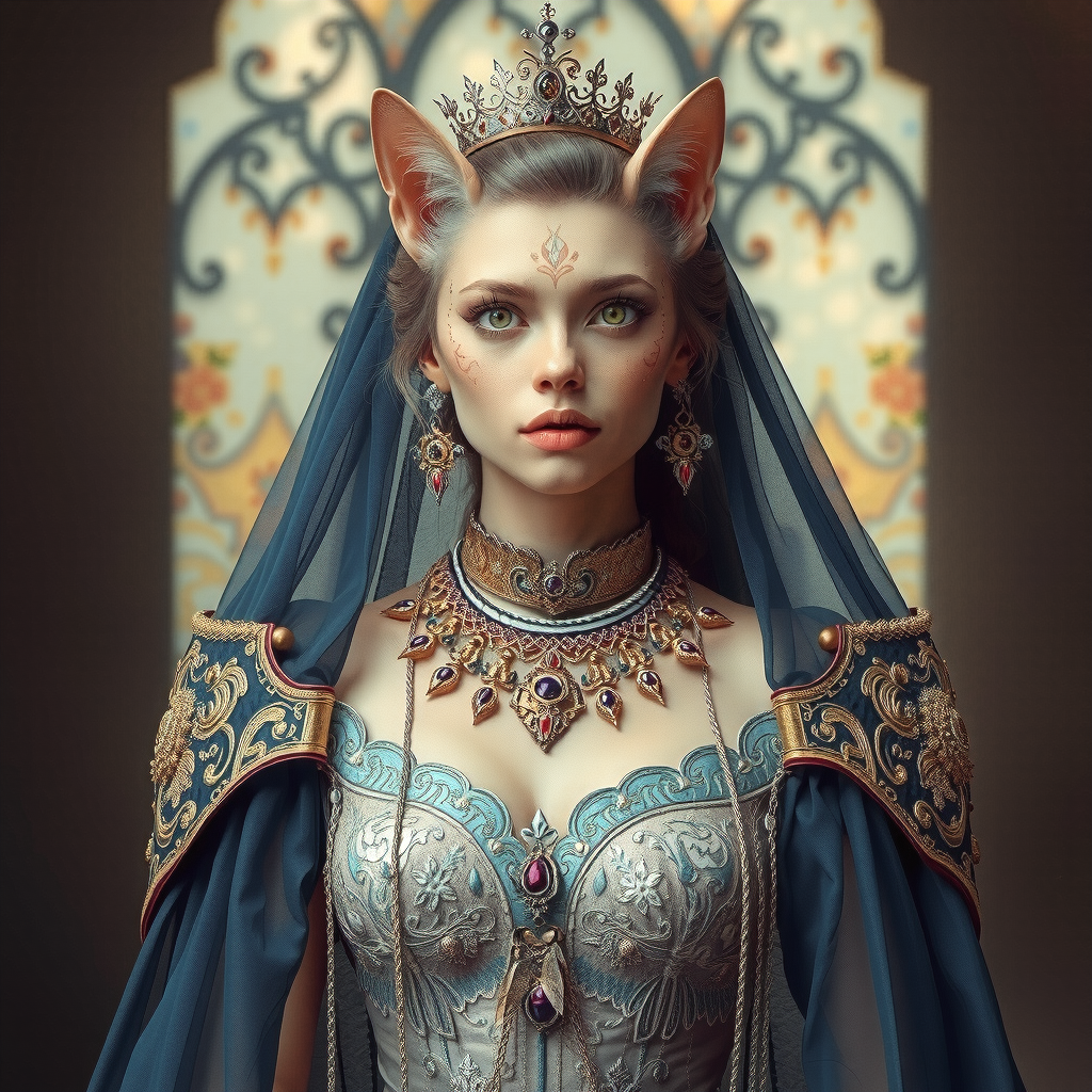 a beautiful queen wearing a sheer royal dress, the woman is both human and cat