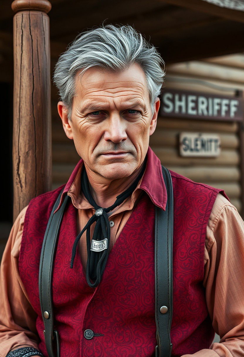 depicting a close up of a middle aged gunslinger in his late 40s. His face is weathered and scarred from a rough lifestyle. He has greying blond hair that is short at the back and sides. He is dressed in a red silk vest with a dark red paisley pattern, over a cream-colored shirt. He wears a black and silver bolo tie and brushed steel bracelets. He is standing outside an old west sheriff's office, leaning against one of the pillars that holds up the awning.