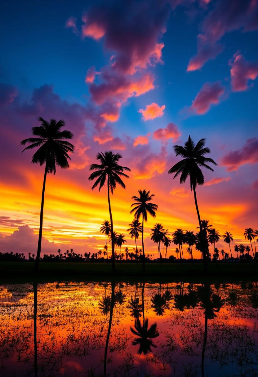 A stunning landscape scene featuring a vibrant sunset with dramatic clouds in the sky, reflected in the calm waters of field. The silhouette of tall palm trees stands majestically against the colorful evening sky, blending orange, pink, and blue hues. The reflection in the water mirrors the scene, creating a serene and symmetrical composition. The overall mood is peaceful and reflective, capturing the natural beauty of a tropical countryside at dusk. No watermarks or text on the image.
