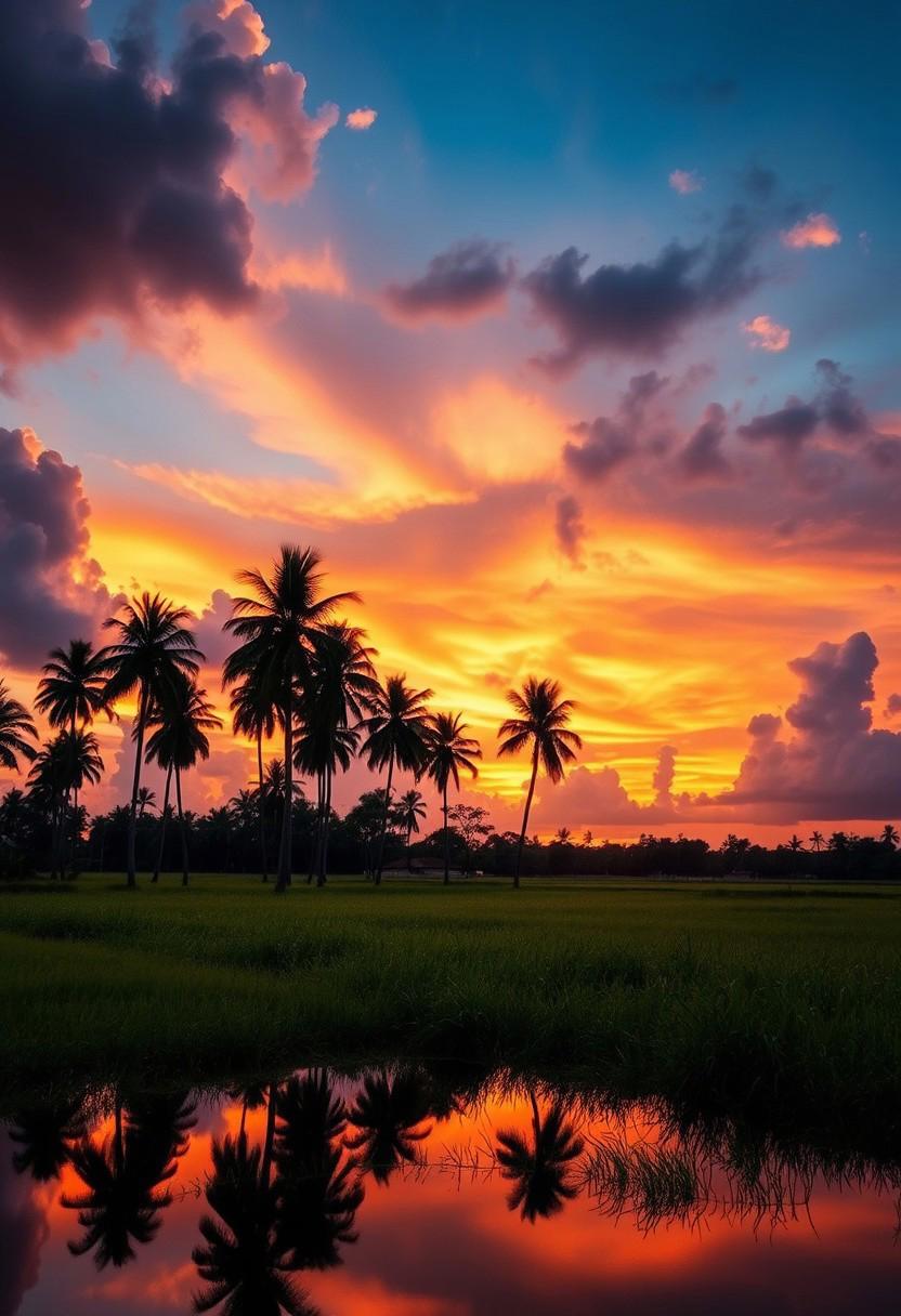 A stunning landscape scene featuring a vibrant sunset with dramatic clouds in the sky, reflected in the calm waters of field. The silhouette of tall palm trees stands majestically against the colorful evening sky, blending orange, pink, and blue hues. The reflection in the water mirrors the scene, creating a serene and symmetrical composition. The overall mood is peaceful and reflective, capturing the natural beauty of a tropical countryside at dusk. No watermarks or text on the image.