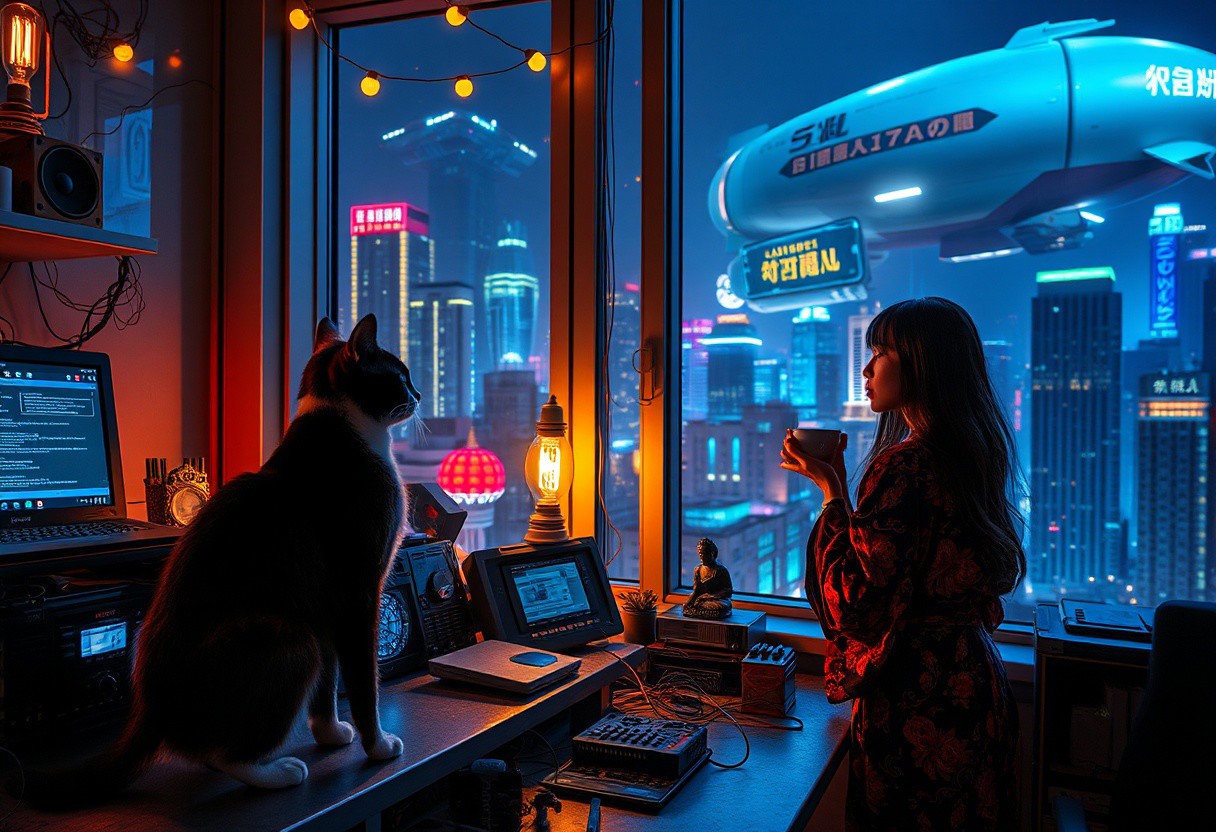 The focus is on a black cat with white feet and white neck is sitting on a metal desk among a clutter of electronics, the cat is staring out of a large window looking out at the futuristic night time cyberpunk city skyline with skyscrapers and a large futuristic dirigible adorned with lights and displaying advertisements in Japanese. A small buddha statue composed of crystal, gold, and glowing copper and jewels, sits on a high shelf, exquisite detail, halloween decorations, halloween string lights, Metal surfaces, halloween themed string lights hanging from the ceiling, small halloween figurines on the desk, electronics, wide angle view of room, cyberpunk style apartment with futuristic aesthetic with neon and led lighting, antique electronic devices, the room contains many electronics and futuristic displays displaying code and images of the robots schematics, a young slender Japanese woman, 24 years old, is standing next to the cat looking out the window, wearing an ornate Japanese Yukata Robe and drinking a cup of tea. The room is lit by blue, green and red neon lights of computers and electronics in the room as well as an antique filament lamp.
