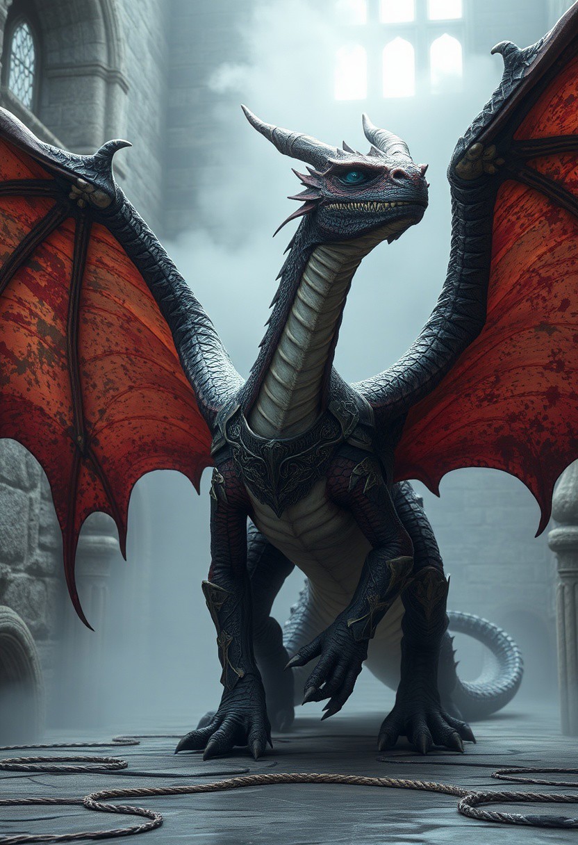 Wyvern with huge wings, mist rising off it ,(in a ancient stone castle) , ornate armour, supermodel, action, dynamic pose, large detailed dragon, 8k , looking at the camera , small smile, bright colours (rotting flesh ) skin pealing off, cold blue eyes , frost breath, hyper realistic, photography style, ultra detailed