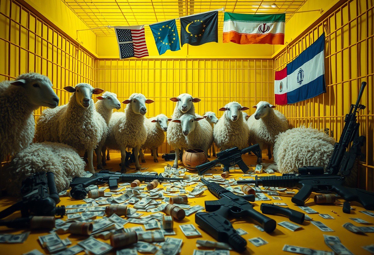 Inside a large, bright yellow cage, a mix of anthropomorphic sheep and humans interact, blending both species’ features in a surreal tableau. The scene is illuminated with cinematic lighting, casting dramatic shadows that enhance the tension. Scattered across the floor are euros and dollars, lying chaotically alongside hand grenades and M16 rifles, creating a symbolic atmosphere. Above the cage, European Union, USA, Ukrainian, Israeli, and Iranian flags wave gently. The image is captured as if through Panavision Himax lenses, adding a rich depth of field that emphasizes the contrast between the lively figures and the ominous presence of weapons and money