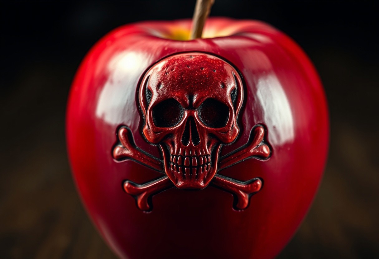A gorgeous, shiny red apple (Product RED) featuring a large, deeply carved, intricate skull design with two bones crossed beneath it, resembling a pirate flag. The skull and bones are prominently engraved with deep incisions, creating a striking contrast. The scene is captured with cinematic lighting using Panavision lenses, in a close-up shot. The high-resolution image highlights vivid, intense colors, with the glossy apple surface accentuating the dark, haunting details of the skull and crossed bones.