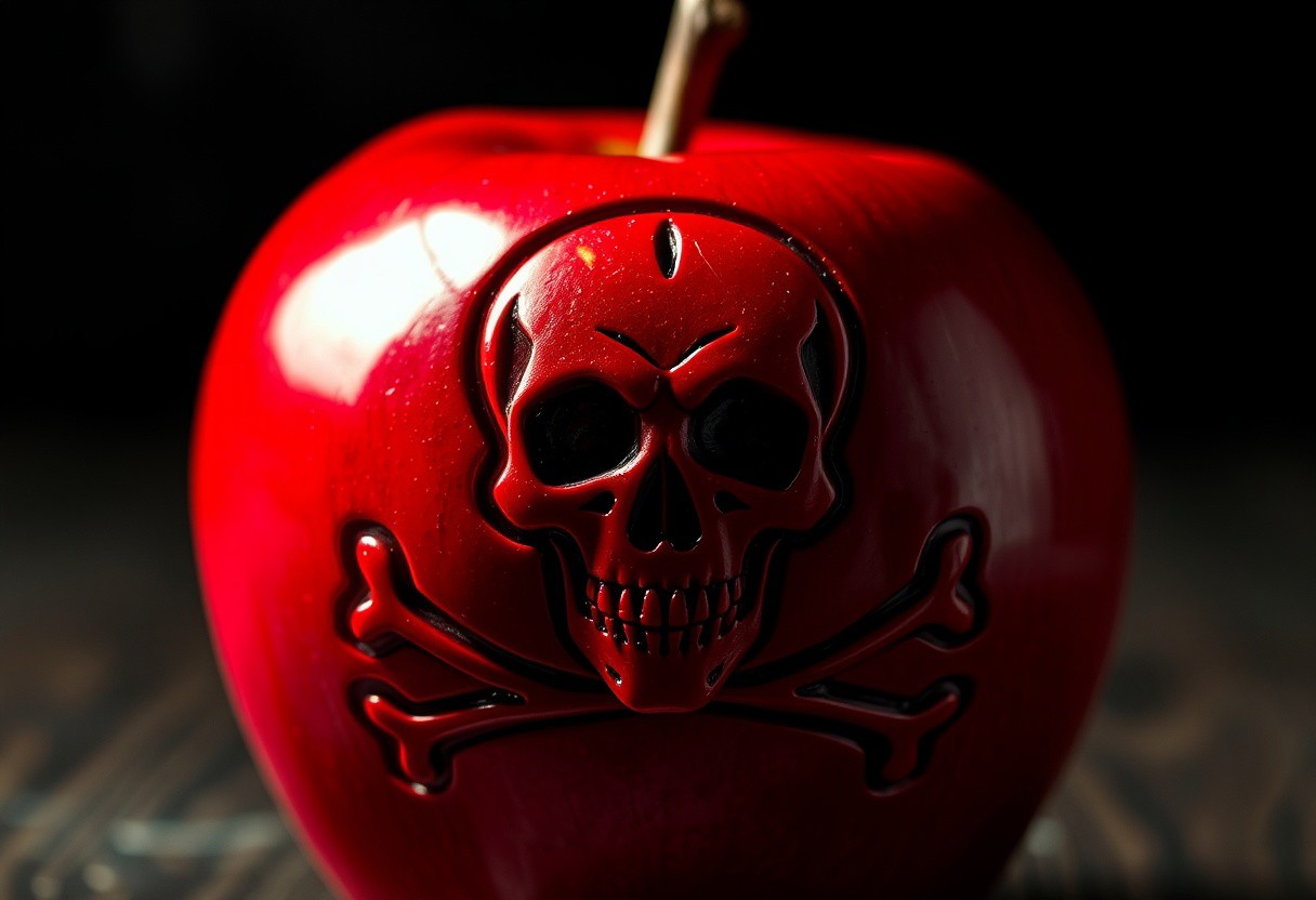 A gorgeous, shiny red apple (Product RED) featuring a large, deeply carved, intricate skull design with two bones crossed beneath it, resembling a pirate flag. The skull and bones are prominently engraved with deep incisions, creating a striking contrast. The scene is captured with cinematic lighting using Panavision lenses, in a close-up shot. The high-resolution image highlights vivid, intense colors, with the glossy apple surface accentuating the dark, haunting details of the skull and crossed bones.
