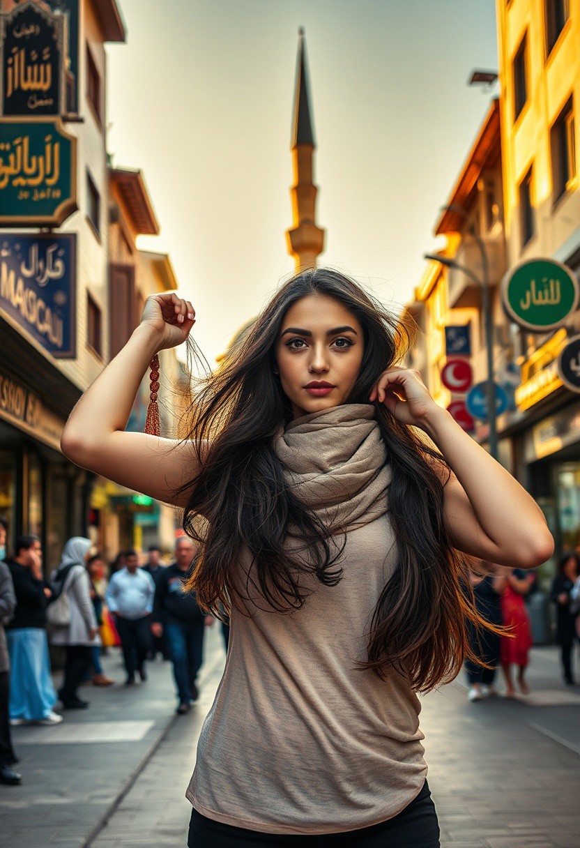 The young woman stands defiantly in the middle of a bustling street, her beauty radiant. As she pulls off her hijab, her long, dark hair flows in the breeze, reflecting the sunlight. Her striking features—high cheekbones, full lips, and deep brown eyes—capture both strength and vulnerability. Persian and Arabic shop signs line the street, their elegant script glowing under the fading sunlight. The silhouette of a mosque rises in the background, its minaret casting a long shadow over the scene. Onlookers watch, some with awe, others with fear, as the morality police close in. The sound of distant calls to prayer blend with the hum of the city, but all eyes are on her, a symbol of freedom against repression.