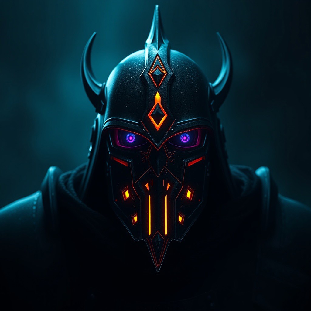 Dark background, warhammer 40k, glowing dark astartes helmet