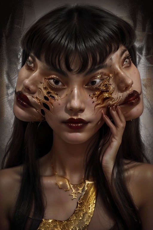 Portrait of a black marble face of tomie kawakami, a silk scarf covers her head, golden textures of gold, liquid gold oozing out, high contrast, gold and silver details, silhouette, ochre and black tones, low angle, side lighting, hyperdetailed, hyperrealistic, 3D