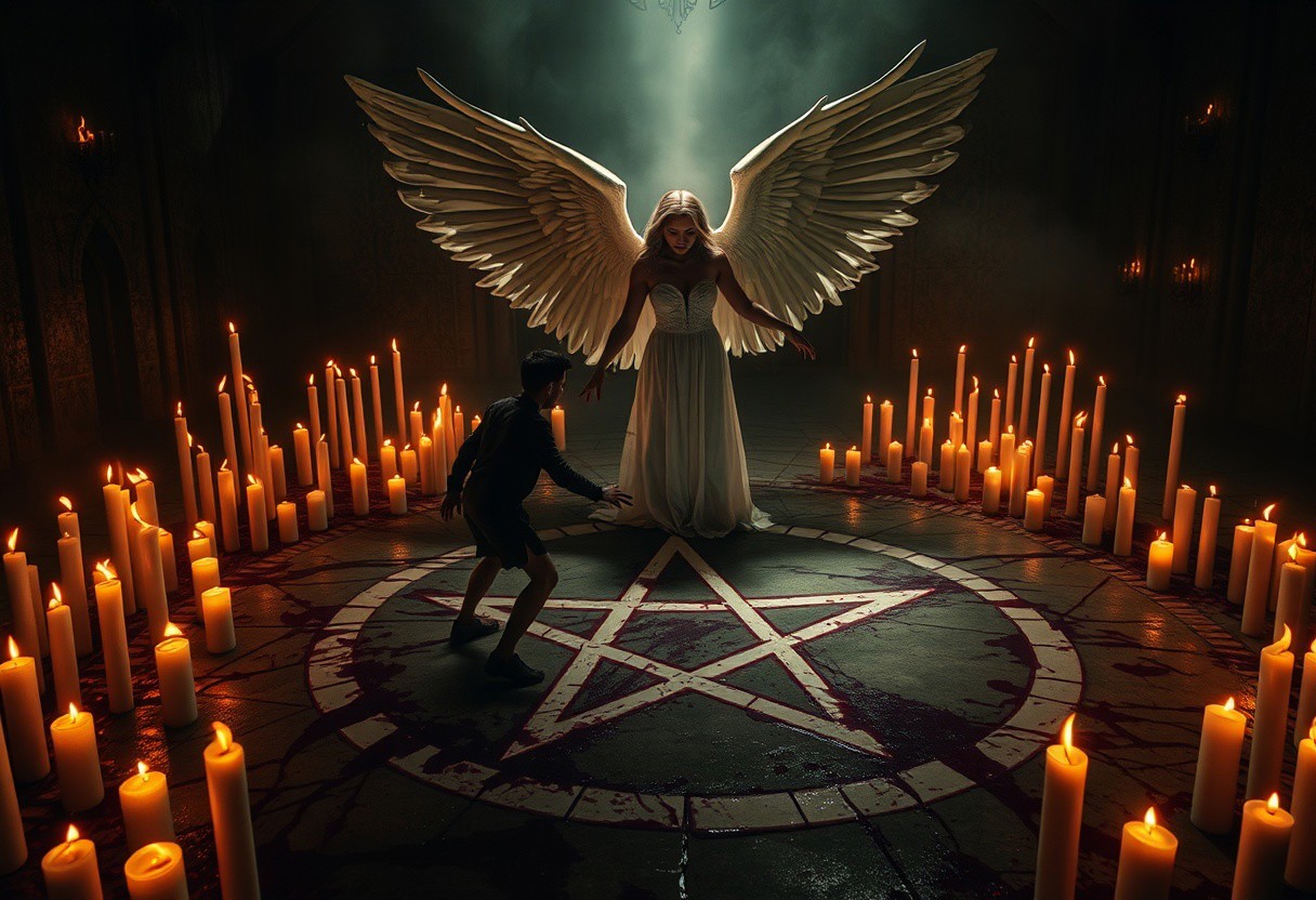 A master-level, highly detailed dark fantasy scene, in the hell, set in a dimly lit, ominous room. The floor is marked with a large, blood-drawn pentagram, its sinister lines glowing faintly. Surrounding the pentagram are countless dark white candles of varying lengths and thicknesses, their flickering flames casting unsettling shadows across the room. fire flames and blood on the walls, At the center of the pentagram, a beautiful angel woman with big wings big breast is emerging from the blood-drawn symbol. an angelic light across the roof through the darkness, and a small black demon with ripped clothes extending his arms to the angel Covered in shadows