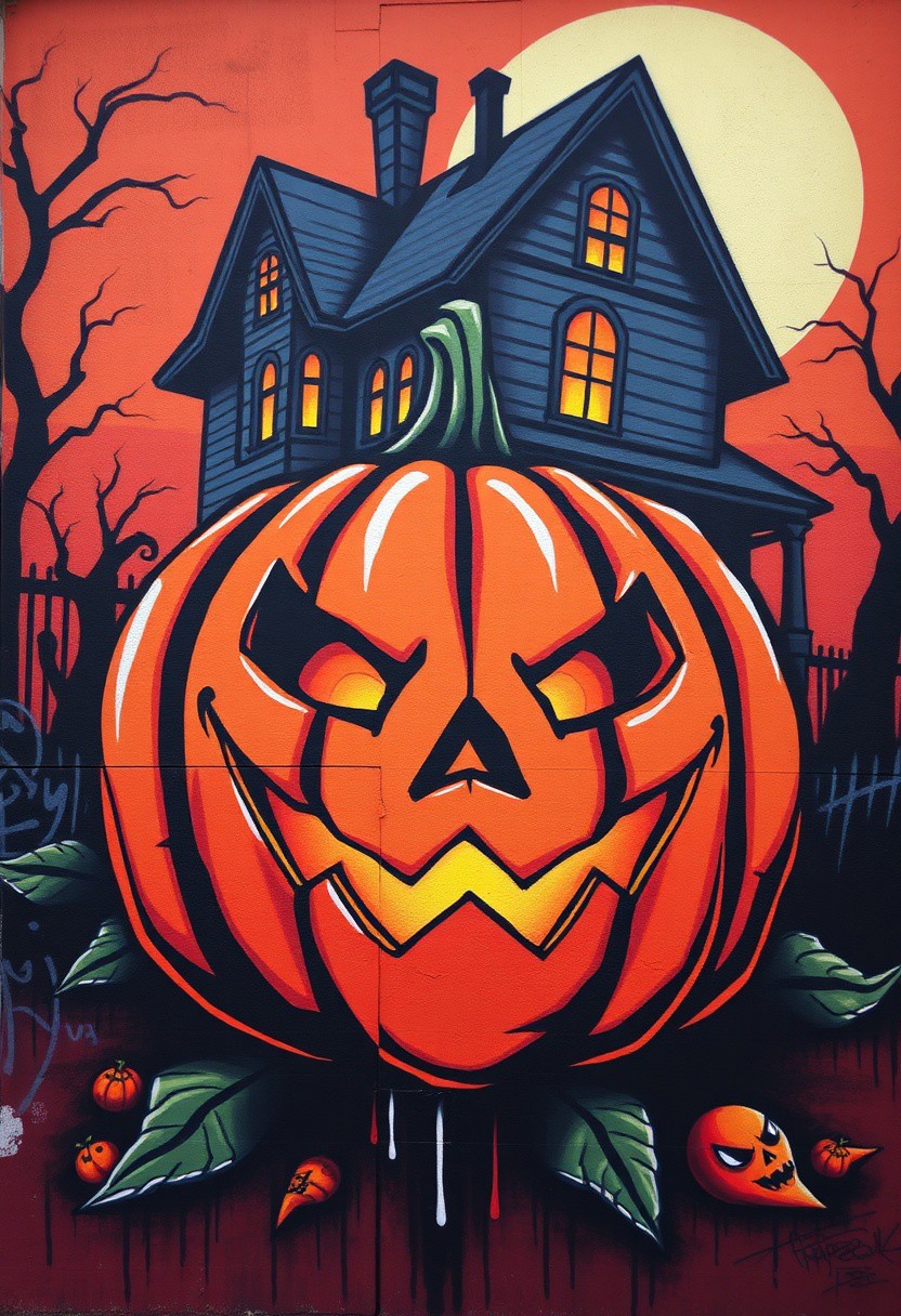 Graffiti art of a jack o lantern with a haunted house in the background, street art, mural, halloween, highres, good quality