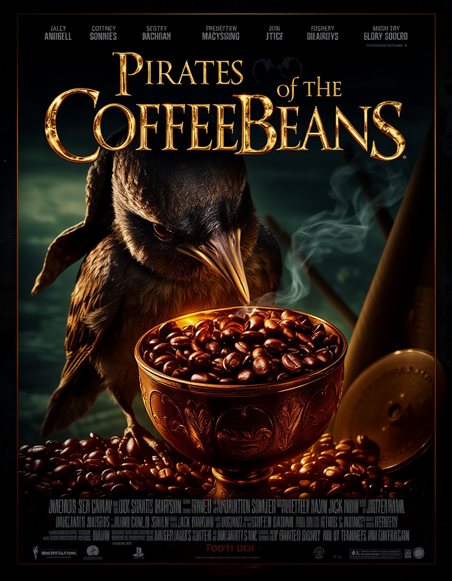 cinematic style, beauty, realism, photorealism, chiaroscuro, high quality mvpstr a movie poster titled "Pirates of the Coffeebeans", with a jack sparrow smelling coffee beans in a golden goblet