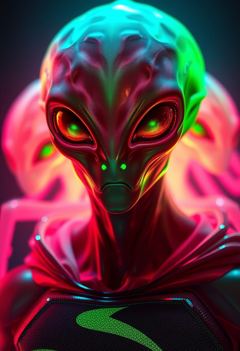 A full body shot of Gearing towards an anime style superhero, Superman as a beautifully intricately detailed bioluminescent alien emerges, illuminated with the vivid hues of alien creature in pastel pinks and vibrant greens against a lustrous and complementary dark-colored background, evoking a sense of coziness and delight. The eyes have a dream-like quality soft focus, boasting an impressive soft vignette against the shimmering metallic digital silhouette of the creatures. The overall scene encapsulates a feeling of stillness, serene tranquility, and sheer beauty.