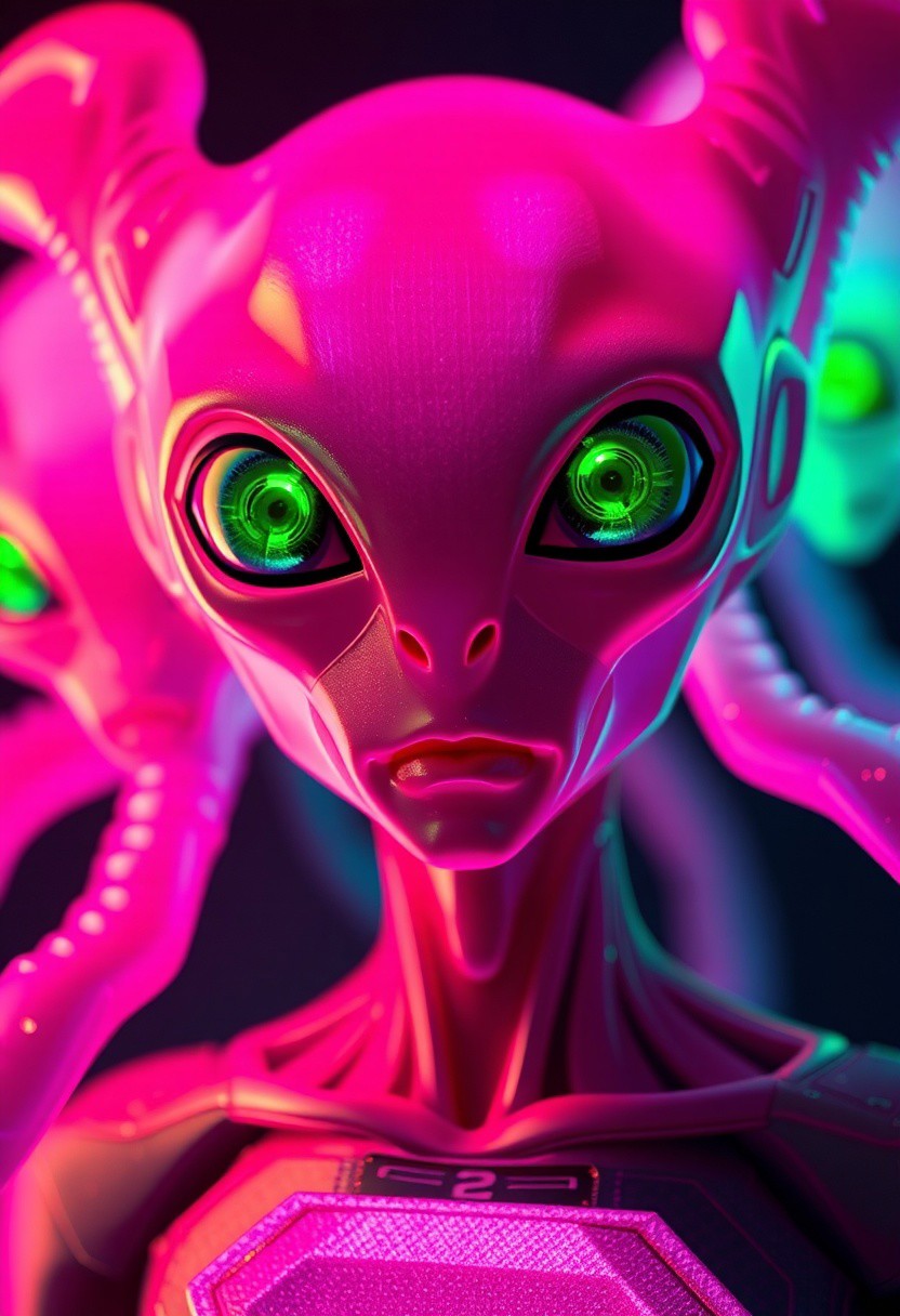 A full body shot of Gearing towards an anime style superhero, Superman as a beautifully intricately detailed bioluminescent alien emerges, illuminated with the vivid hues of alien creature in pastel pinks and vibrant greens against a lustrous and complementary dark-colored background, evoking a sense of coziness and delight. The eyes have a dream-like quality soft focus, boasting an impressive soft vignette against the shimmering metallic digital silhouette of the creatures. The overall scene encapsulates a feeling of stillness, serene tranquility, and sheer beauty.
