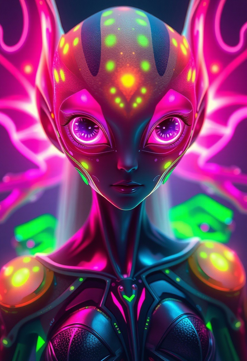 A full body shot of Gearing towards an anime style superheroine, Supergirl as a beautifully intricately detailed bioluminescent alien emerges, illuminated with the vivid hues of alien creature in pastel pinks and vibrant greens against a lustrous and complementary dark-colored background, evoking a sense of coziness and delight. The eyes have a dream-like quality soft focus, boasting an impressive soft vignette against the shimmering metallic digital silhouette of the creatures. The overall scene encapsulates a feeling of stillness, serene tranquility, and sheer beauty.