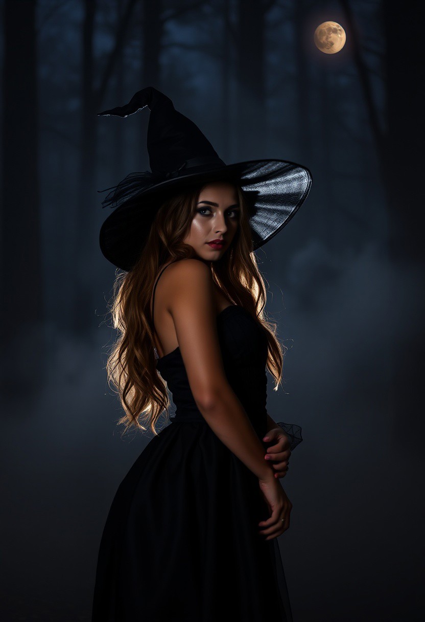 high-resolution professional photo of a young woman dressed as sexy witch for Halloween in the forest at night. There is fog in the background and a half moon in the sky. Dramatic lighting