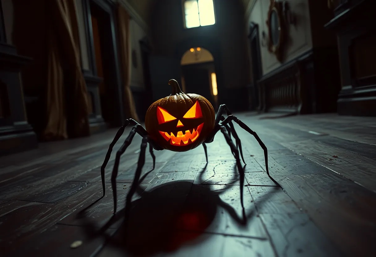 Photo of a small Jack-O-Lantern pumpkin with spider legs like human fingers creeping on a floor . Kodak MC3 Photo Style. Snapshot from an 80's horror film. Creepy, mysterious, frightening scene. The pumpkin appears to be about to jump on the viewer. Evil grin. Spider legs looks like long thin creepy human fingers. Background a dark creepy abandoned old mansion with torn curtains and dust-covered floors. Ultra realistic vintage photo. High detail. Cinematic horror movie scene. High angle. Gloomy mansion with dark corridors. Horror movie scene with dramatic shadows and high contrast. Surrealist horror. Dynamic action scene. Film grain. The overall atmosphere is one of old horror movies. captured in the style of a documentary photograph. Depth of field. Dutch angle, view from above.