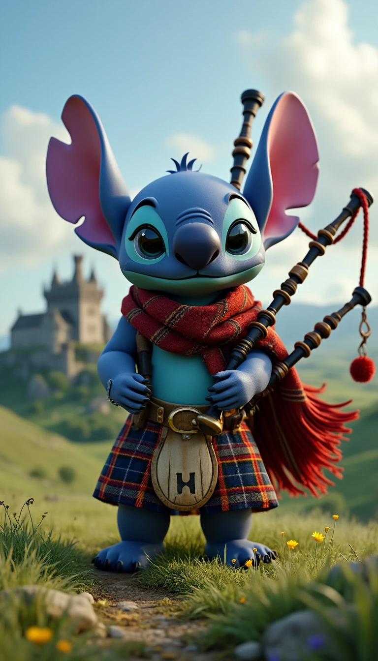 Generate an 8K 3D image of Stitch wearing a traditional Scottish kilt and sporran, with a tartan scarf draped over his shoulder. He’s standing on the green hills of Scotland, with a castle in the background. His expression is proud, and he’s holding a bagpipe.
