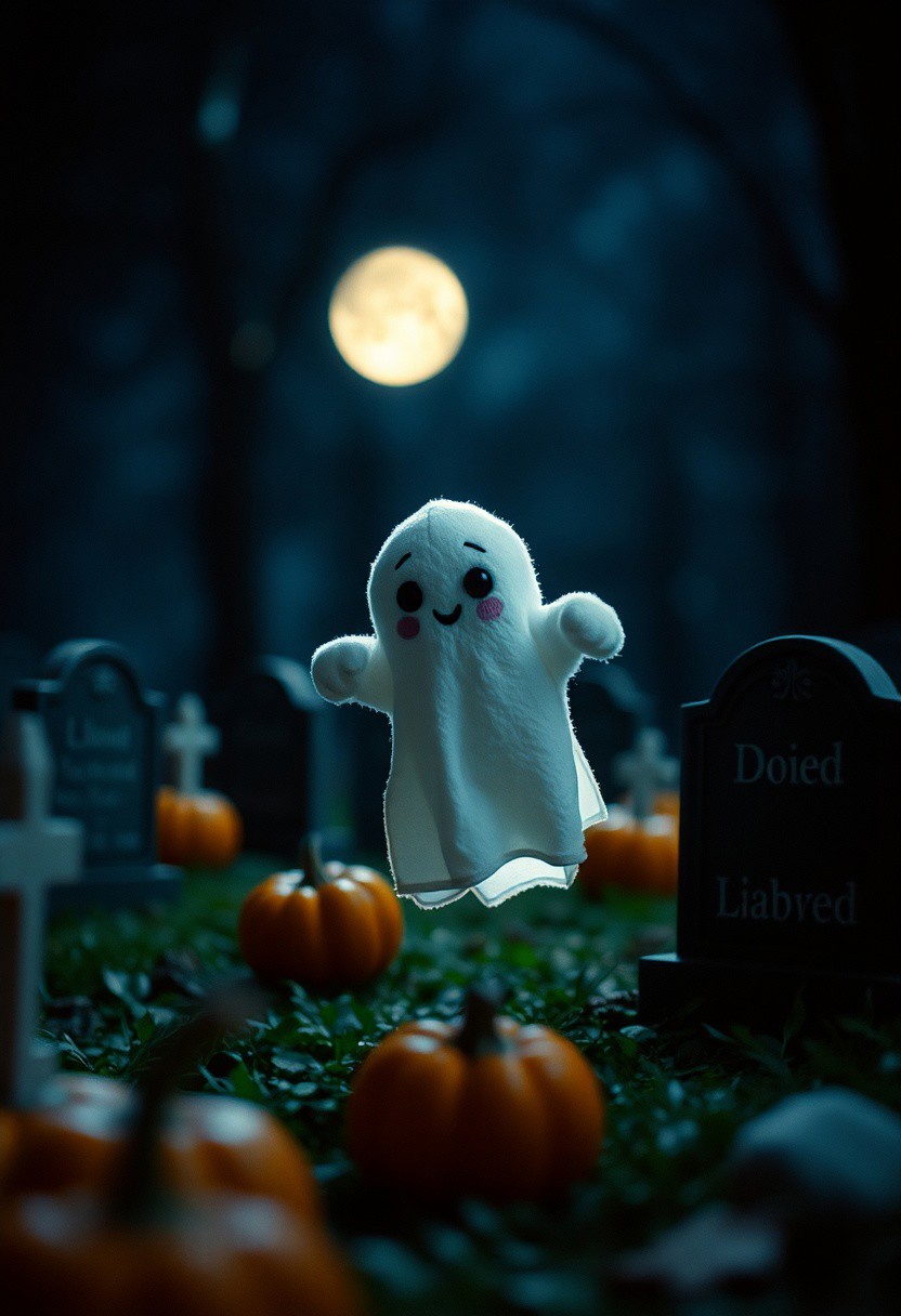 35mm photograph, film, bokeh, professional, in the graveyard sits one adorable cute plushie ghost, floating above ground, in moonlight, pumpkins, hyperrealistic, super realistic, sharp focus, 32k, (((masterpiece))) (((ultimate quality))), exquisite beauty, highiest texture resolution, photorealistic, fantasy setting, epic composition, ral-smlvltnpls, fits in frame