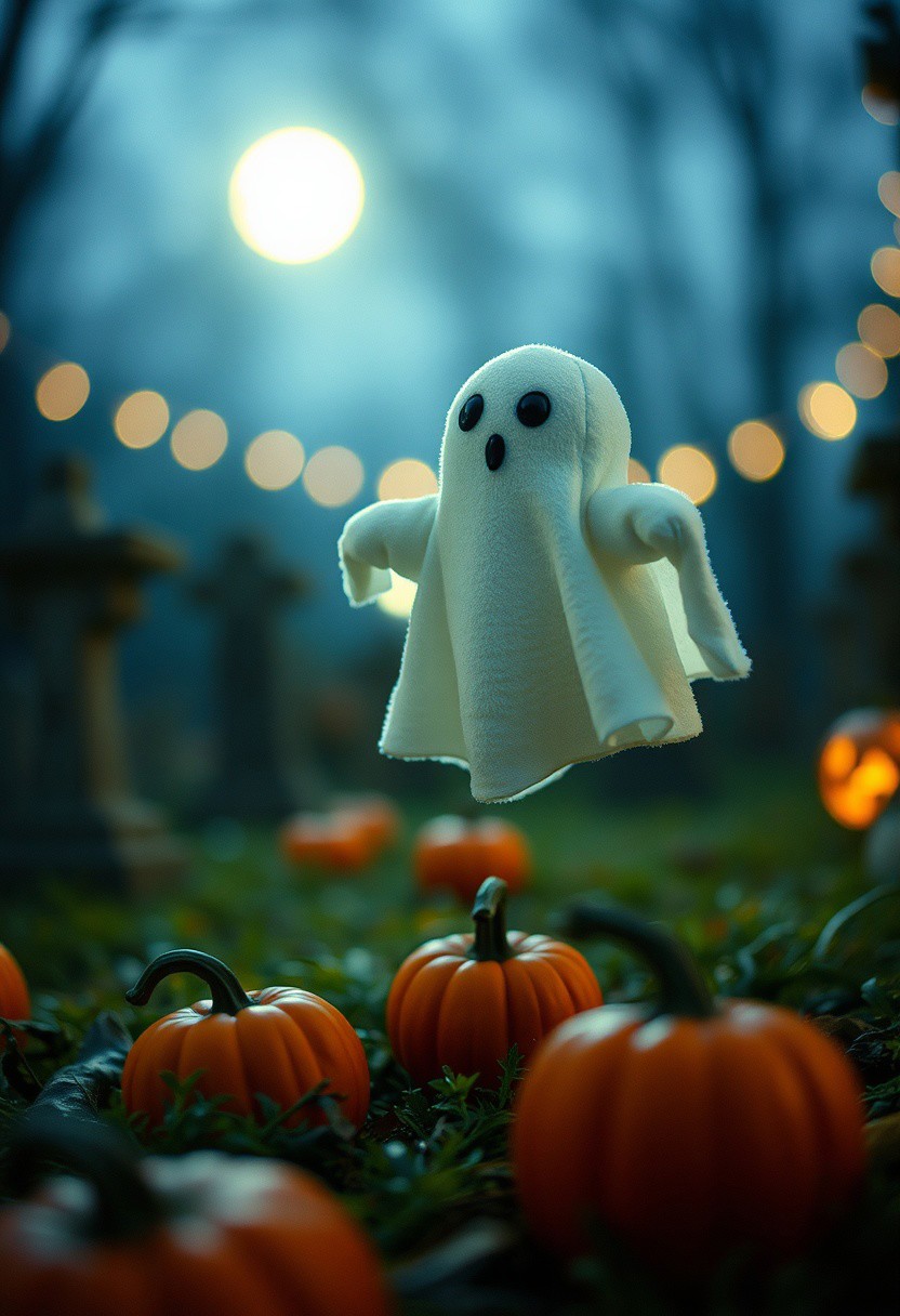 35mm photograph, film, bokeh, professional, in the graveyard sits one adorable cute plushie ghost, floating above ground, in moonlight, pumpkins, hyperrealistic, super realistic, sharp focus, 32k, (((masterpiece))) (((ultimate quality))), exquisite beauty, highiest texture resolution, photorealistic, fantasy setting, epic composition, ral-smlvltnpls, close to viewer,