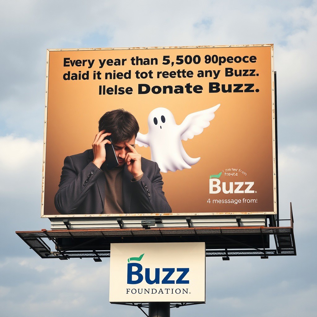 PSA Billboard: Advertisement Billboard of depressed guy on phone, with Ghost Buzz Lightning Symbol with wings flying from the phone, text "Every year more than 5,000 people did not receive any Buzz. Please Donate Buzz". The Logo Buzz Symbol with the text "Buzz Foundation" with the text "A message from:" on top of the logo, billboard from the United States