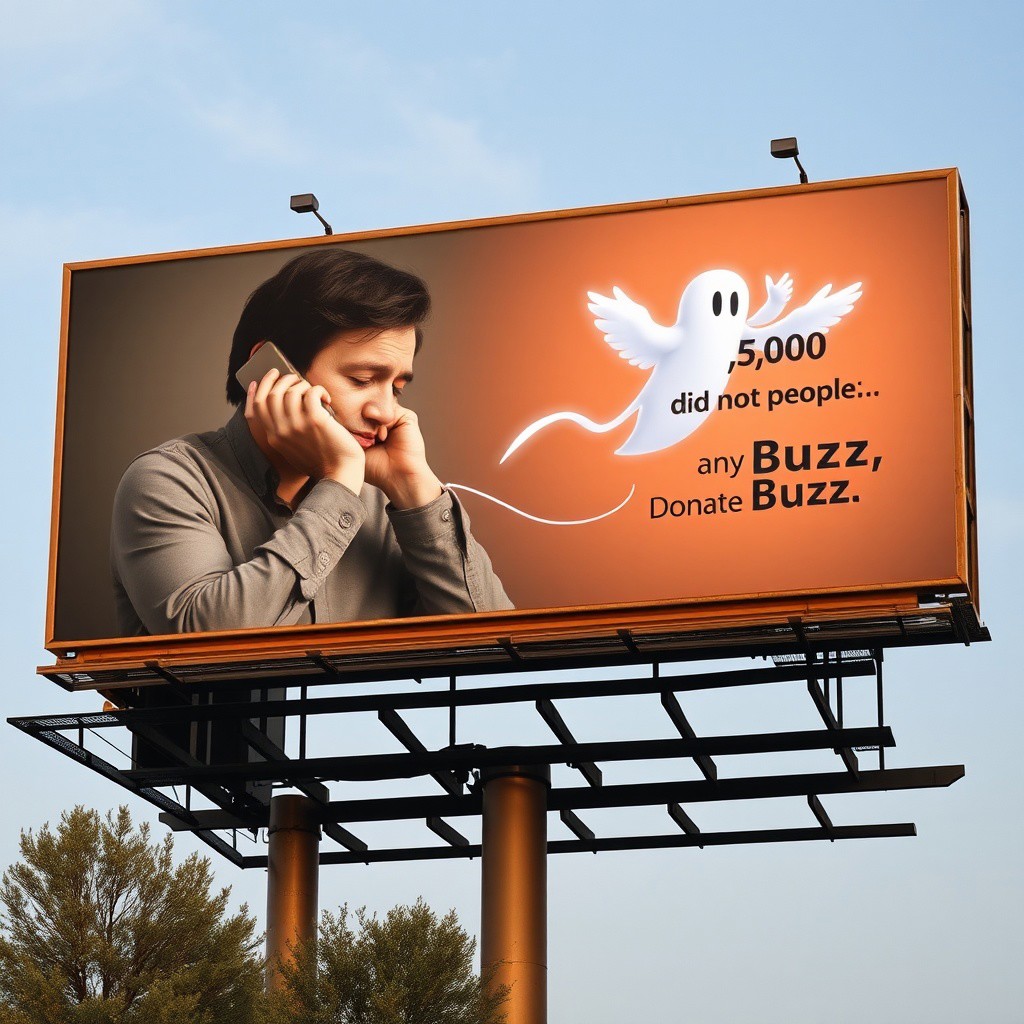 PSA Billboard: Advertisement Billboard of depressed guy on phone, with Ghost Buzz Lightning Symbol with wings flying from the phone, text "Every year more than 5,000 people did not receive any Buzz. Please Donate Buzz". The Logo Buzz Symbol with the text "Buzz Foundation" with the text "A message from:" on top of the logo, billboard from the United States