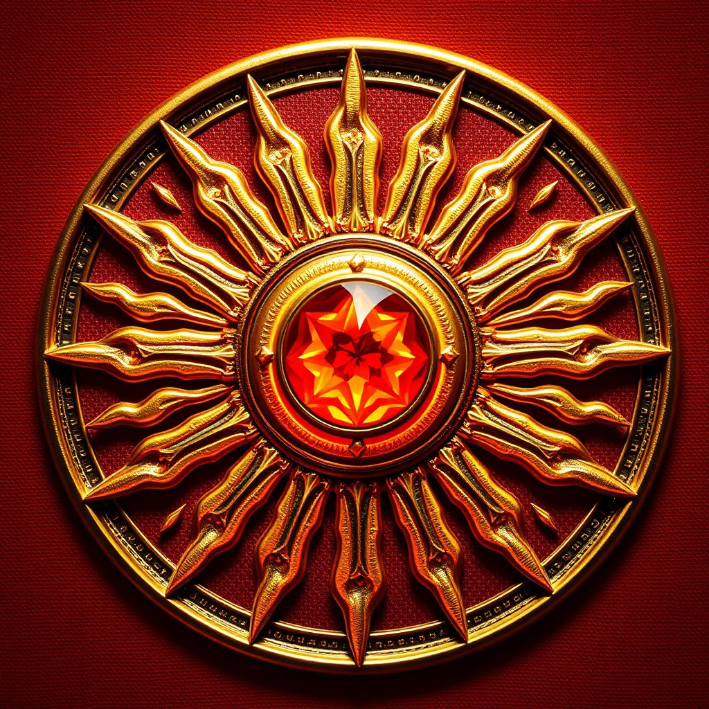 The sacred emblem of the Church of the Blazing Sun is a radiant symbol of divine fire and light. At its center is a glowing sun disk, crafted from gold, with flames etched in intricate detail radiating outward. These flames flicker with divine energy, symbolizing the purity and power of the sun. Surrounding the disk is a halo of fiery rays, each ray representing an aspect of illumination and divine wisdom. Embedded within the center is a crimson gemstone, glowing with an inner fire, reflecting the blazing fervor of the church's doctrine. The emblem is often displayed on priestly garments, altar cloths, and temple walls, exuding warmth and intensity. It serves as a constant reminder of the church’s creed—light overcoming darkness, fire purifying all, and the sun's endless cycle of rebirth. The detailed flame motifs and metallic shine reflect the church’s power and relentless pursuit of truth.