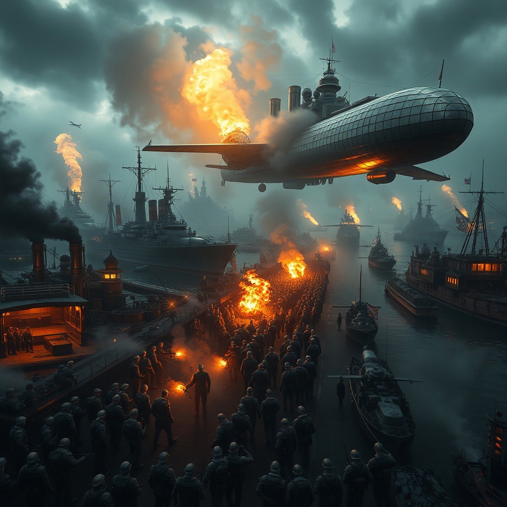The harbor is alive with the frenetic energy of mobilization. The ground trembles with the march of soldiers in ironclad armor, their ranks perfectly aligned as they prepare for war. Navy battleships, forged in industrial-era brilliance, await departure, their chimneys belching thick plumes of smoke into the darkening sky. In the high sky, The Kingdom's steampunk airships formation looms high in the harbor sky, its massive hull gleaming with bronze and iron plates. Gears and propellers churn in the misty air, as steam hisses from exhaust vents, propelling the ship toward the horizonThe chaotic scene is framed by an epic, high-angle shot, capturing the convergence of air and sea forces. Explosions and the clanging of machinery fill the air as the ships prepare for battle. The dramatic, violent atmosphere is heightened by flickering lights and storm clouds gathering overhead, casting the scene in cinematic, moody lighting. The full-frame composition amplifies the tension, as both airships and battleships are set to unleash their mechanical fury.
